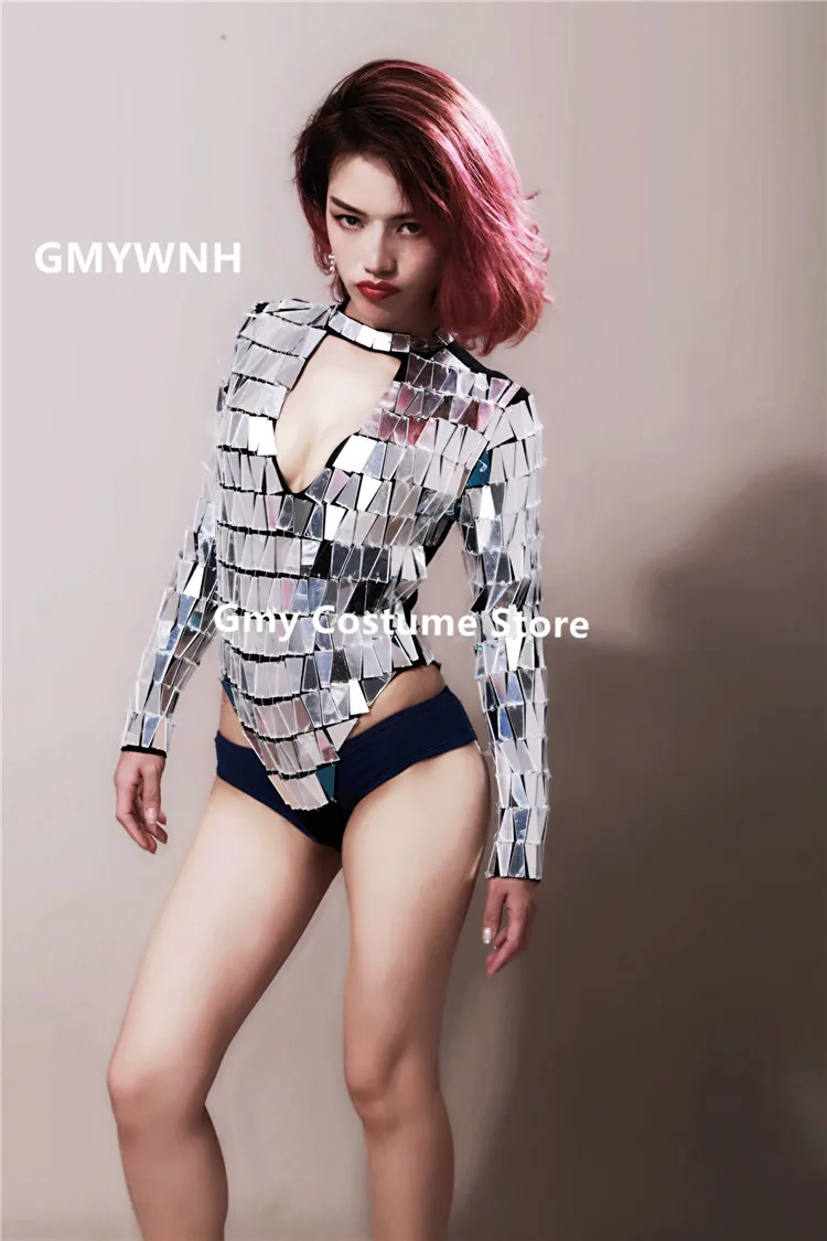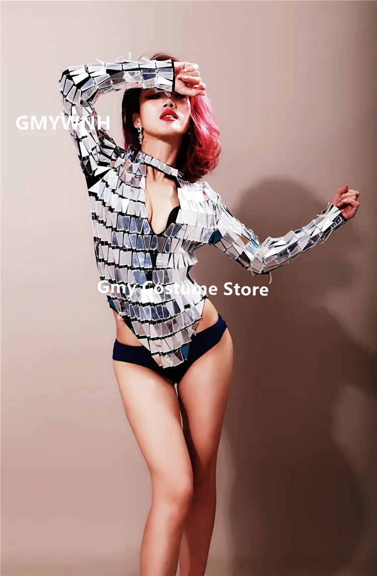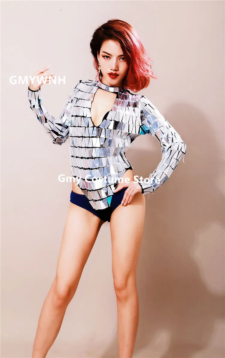 Best Offer P59 Ballroom dance silver mirror costumes stage dance wears women High fork bodysuit long sleeve se