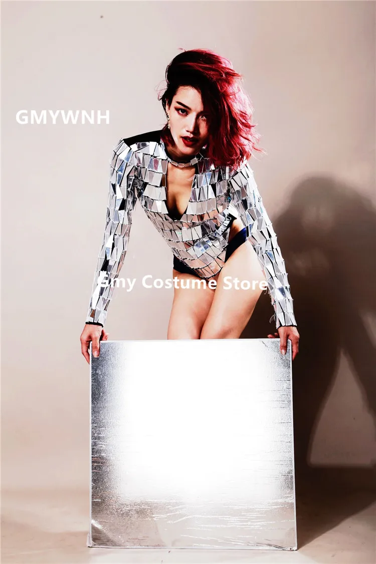 Best Price P59 Ballroom dance silver mirror costumes stage dance wears women High fork bodysuit long sleeve se