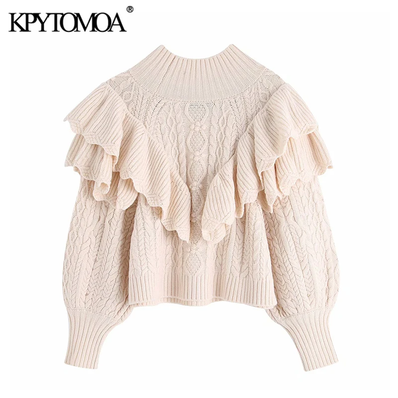 Best Deal Vintage Stylish Short Style Ruffles Knitted Sweater Women 2019 Fashion High Neck Lantern Sleeve Fem